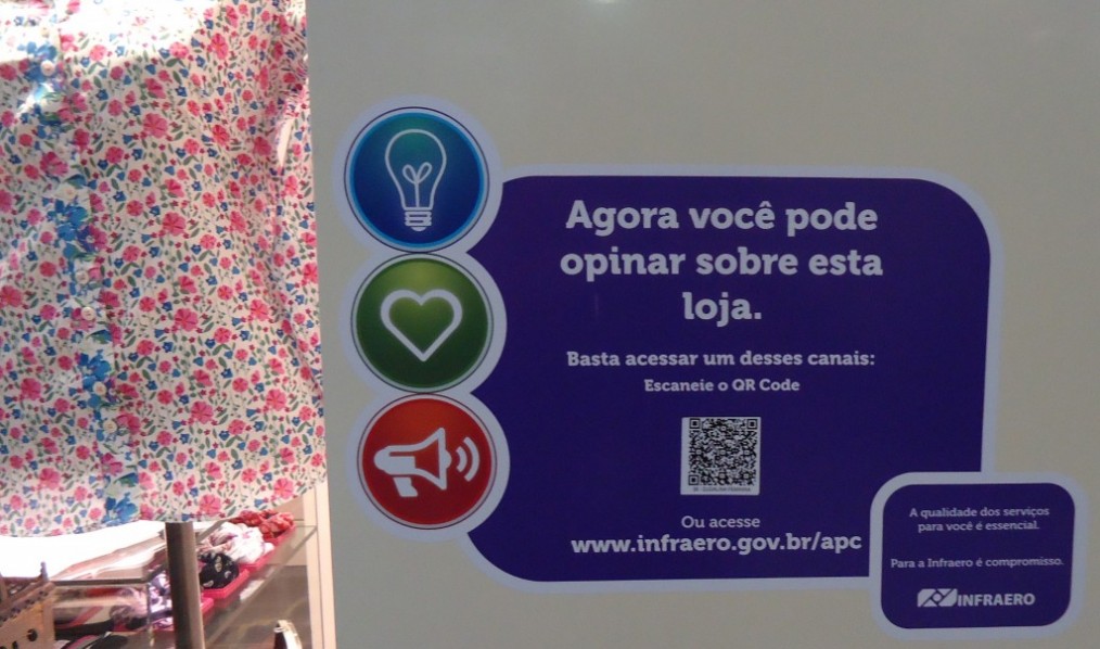Segundo o blog Todos a Bordo, o usuário do aeroporto poderá avaliar sobre lojas e lanchonetes por meios de adesivos com tecnologia QR Code, colocados pela Infraero. O projeto é um piloto da iniciativa, que será replicada em outros aeroportos pelo país. Segundo a Infraero, toda avaliação será respondida com informações sobre o andamento da demanda.