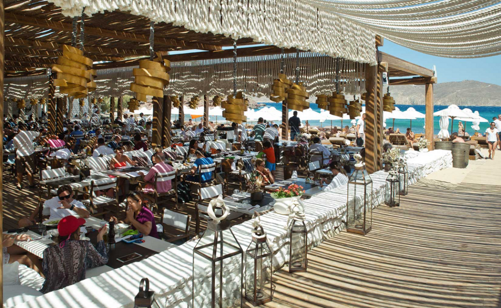Já o Caprice Bar, mistura elegância clássica com inovação, cheio de estilo. O local já foi eleito um dos 10 melhores bares do mundo e é famoso por atrair celebridades internacionais e turistas e, busca de uma das melhores vistas para o pôr do sol de toda a ilha em um ambiente acolhedor e ideal para experimentar drinks exclusivos e curtir a noite de Mykonos. Para quem gosta de alta gastronomia, badalação e serviços impecáveis, o Beach Club Scorpio é o lugar. Durante a alta temporada, o local recebe shows ao vivo e algumas das principais festas de Mykonos.
