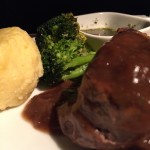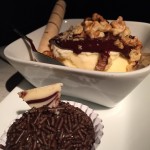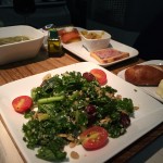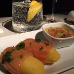 Já na volta ao Brasil, as entradas foram bem menos saborosas: nozes pecan, salada de couve com maçã e tomates e minipatê de carnes de boi e porco, e blins de milho cobertos com salmão. Em compensação a minha opção de prato principal estava mais saborosa que na ida: Costelas de carne de vaca refogadas com molho demi-glace, purê e cenouras. As outras opções eram peito de frango grelhado com molho de tomilho, arroz verde tomates e aspargos, orecchiette com molho de pimenta do reino e ervilhas, ou salamão assado com palmito e abacate. A sobremesa era igual a da ida, com diferença que a seleção de doces variados era um pouco mais elaborada.