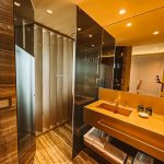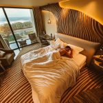 O Onice Sea View, nosso quarto no Vila Foz Hotel, oferece uma charmosa varanda para contemplar o mar, que também pode ser apreciado da grande e confortável cama, ou até mesmo do chuveiro, estrategicamente colocado em uma parede de vidro (com cuidado de ter uma divisória de design para não deixar tão devassado).