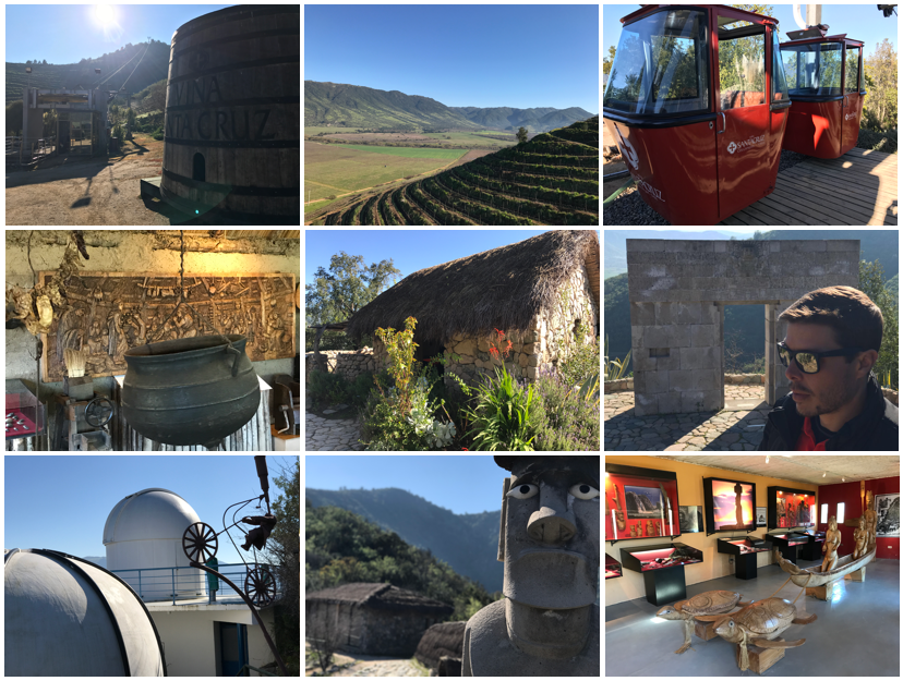 Com tantas atrações juntas, a Vinícola Santa Cruz oferece diferentes tipos de passeios. Vale ver todas as opções e escolher a que mais se adequa a seu perfil. Mas, além de degustar os vinhos e aprender sobre a produção, vale a pena conhecer também Cerro Chamán, certamente um diferencial desse passeio. Para chegar até ele você pega um teleférico que já é parte de destaque da visita, afinal a linda vista dos vinhedos do enquanto sobe é impressionante. Lá em cima, além de avistar toda a região, você poderá conhecer mais sobre os povos nativos do Chile em pequenos museus e réplicas de casas dos Mapuche, Aymara e Rapa Nui. Além disso poderá conhecer a linda Porta do Sol e também réplica dos Moais da Ilha de Páscoa. É nesse morro também que fica o observatório onde acontece a noite o tour astronômico.